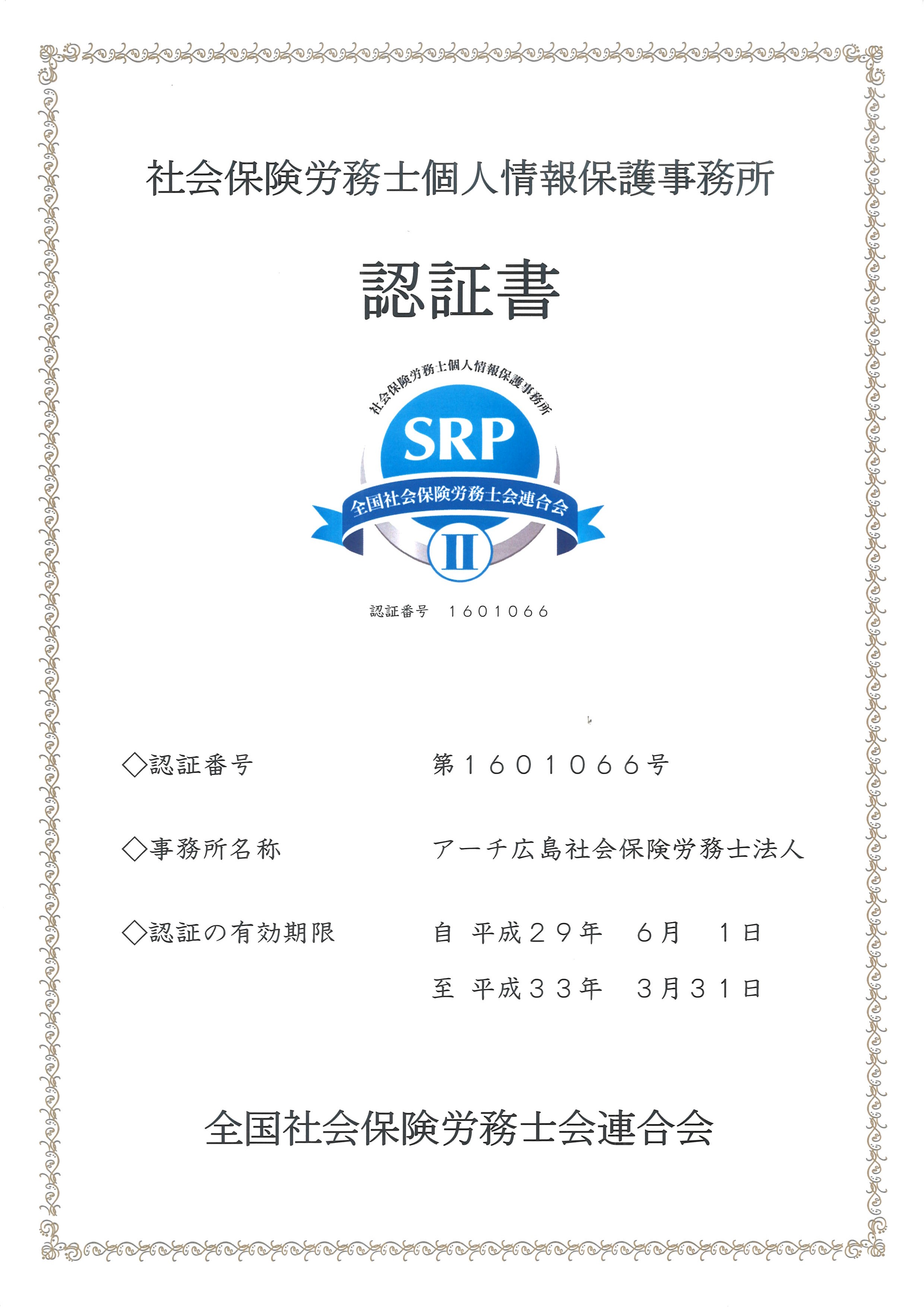 平成20年より、社会保険労務士の全国組織である社会保険労務士連合会が、社会保険労務士独自の個人情報の保護制度として、その信用と信頼を担保する仕組みとしてSRP認証制度を創設いたしました。当事務所はそのSRP認証の認証事務所(第398号)として認証を受けたものです。